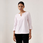 • Features a split neckline and 3/4th length sleeves with tuck detailing