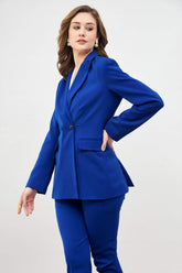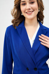 An artfully tailored, lined, double-breasted blazer in electric blue Features a notched collar lapel, side back vents, flap pockets, and full-length sleeves Crafted in moss lycra to offer a solid finish Layer it over a dress for a chic aesthetic