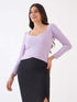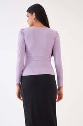 A statement crop top in a soft lilac hue Features a sweetheart neckline, a crossover front, and 3/4th length shirred sleeves Crafted in rib knit fabric to offer a superior drape Team it up with tailored trousers for night outs Round off the look with eye-catching studs.