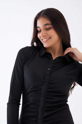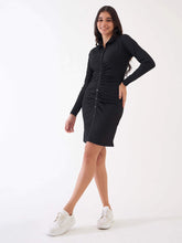 LENGTH DISCLAIMER: The model is 5'11 The garment length will fall as mentioned in the product description A comfortably fitted, above-the-knee length dress in ink black Features a collared neckline, a half functional placket, faux button detailing, a ruched front, and full-length sleeves Crafted in rib knit fabric to offer a smooth drape Put your hair up in a bun and accessorize with statement studs