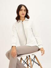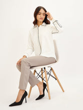The classic Black and White never goes out of style. Our piping detail on a timeless white shirt adds structure to the delicate built of the shirt while the concealed placket detail balances all the elements. Color May Vary Slightly Due To Screen Settings.