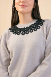 The Dorothy Appliqué Sweater - Light Grey by The Cozy Closet is a cozy woolen sweater perfect for any casual occasion. Its round neck, regular sleeves, and full sleeve length provide comfort and warmth while the grey embellishments add a touch of style. Stay warm and fashionable with AW-23.