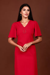 Classic shift dress in a solid red tone. Crafted in Moss Lycra. Features delicate flutter sleeves. Team it up with a pair of black pumps and minimal jewellery for a simple-yet-elegant look.