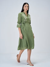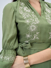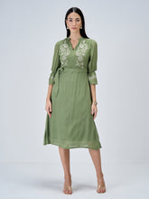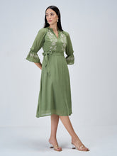 Forest Finesse Embroidered A-Line Dress-Olive/White