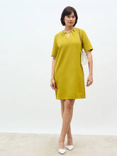 - Semi-formal solid shift dress with elegant neck pleats and metallic trim