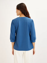 - Features a turned-up neckline and 3/4th length puffed sleeves with pleat detailing at the sleeve hem