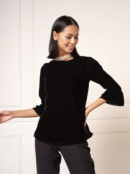 A chic, slip-on top in kohl black Features a boat neckline, a gathered front yoke, and elbow-length sleeves with shirred sleeve caps and gathered cuffs Curated in a luxurious velvet fabric to offer a luxe texture Style it with a pair of relaxed pants Elevate the look with dainty drop earrings and a wristwatch