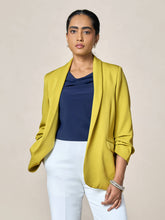 - 3/4th length ruched sleeves add a modern touch