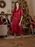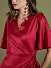 - Elegant wrap-style dress crafted in classic flowy satin fabric