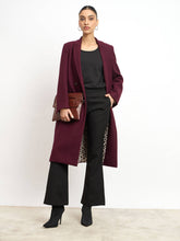 - Polka Printed Lining, Double-Breasted Longline Coat – A timeless outerwear piece in a rich grape wine hue