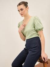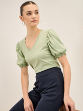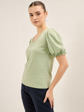Introducing our new Peppy Tee-Mint Gathered Sleeves T-Shirt! This women's top features a trendy v-neck, elbow-length balloon sleeves, and a comfortable 60% cotton and 40% polyester blend. Perfect for any casual occasion, this top is a must-have for summer. Don't miss out on our latest SALT bestseller!