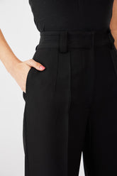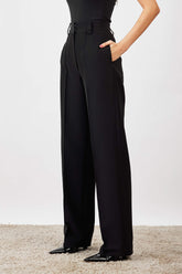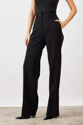 An expertly crafted, high-rise pair of pants in ink black Features a fly front zip closure, side inseam pockets, and straight legs Crafted in moss lycra to offer a durable wearing experience Pair it with a cropped top for brunch dates Style it with a loosely tailored satin shirt for evenings out