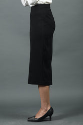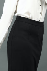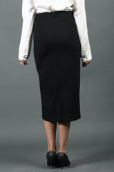 Solid black pencil skirt for work & beyond. Features a zip lining & slit at the center back. Looks perfect when styled with a classic white shirt & a pair of high-heeled sandals.