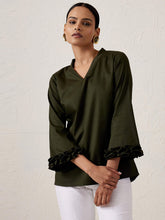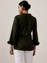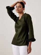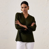 A chic, detail-oriented top in a rich olive-green hue Features a V neckline and 3/4th length smocked sleeves Crafted in cotton lycra to offer a breathable finish Team it up with a pair of relaxed trousers for brunch dates.