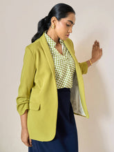 - Features a shawl collar, flap pockets, and 3/4th length ruched sleeves Crafted