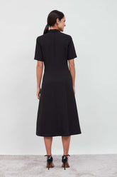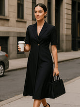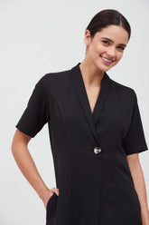 Stunning formal midi length dress in solid black. Comes with a shawl style collar & half sleeves. A large show button for a formal blazer look and a tich button detail on the inside for neck closure. Team up the dress with block heels for a formal & comfy sneakers for a casual look.