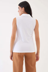 An understated top in a pearl white hue Features a polo collar and a half-placket Crafted in rib knit fabric to offer a premium hand-feel and fluid fall Pair it with relaxed trousers Accentuate the look with statement accessories and strappy heels.