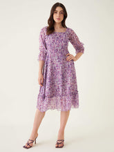 A lined, over-the-knee length, fit and flared dress in an enticing abstract print Features a sqaure neckline, 3/4th length gathered sleeves, tier detailing, and a side zip closure Crafted in a lightweight georgette fabric to offer an airy drape Team it up with sling-back pumps Round off the look with statement earrings