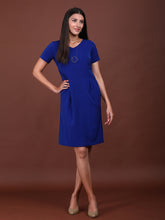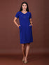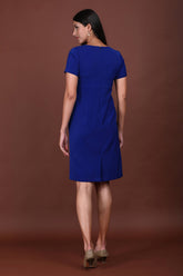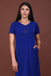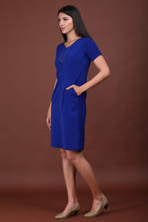 Sheath dress drenched in a solid blue hue. Crafted in Moss Lycra. Comes with a wide waist belt detail. Looks perfect when styles with a pair of classic block or pencil heels &