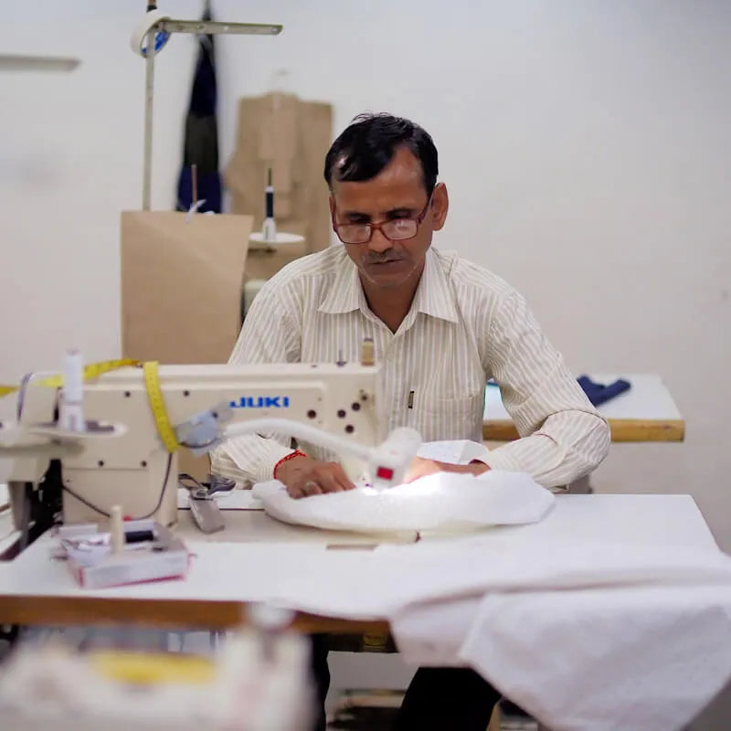 All our garments are made in-house in our workshop. These garments are carefully cut, stitched and finished by our in-house team of tailors. All our tailors are given monthly wages, healthcare benefits, and work in good working conditions. For example, the entire workshop is fully air-conditioned. The conditions our entire team works in is the same as that we would like to keep for ourselves. We believe in Ethical & Fair trade Clothing and have an answer to the popular movement #WhoMadeMyClothes.